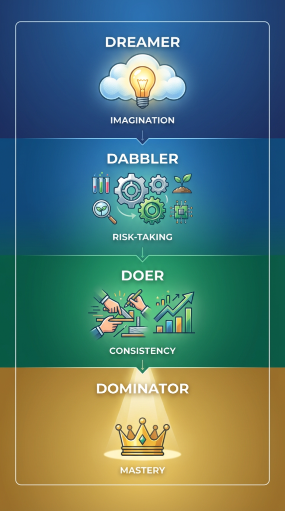 Most entrepreneurs find themselves in one stage or another and start doubting if they’ve “made it.” But remember: being in the dreamer stage doesn’t mean you’re not an entrepreneur. Being a dabbler doesn’t mean you’re failing. Every stage has value; it’s about learning, experimenting, and building toward the next level.