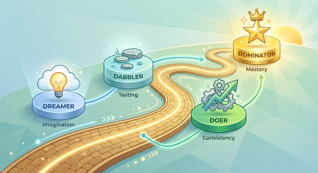 Now it gets exciting. The doer is where you start to build real momentum. You’re no longer just dreaming or experimenting; you’re consistently working on one thing and getting results.